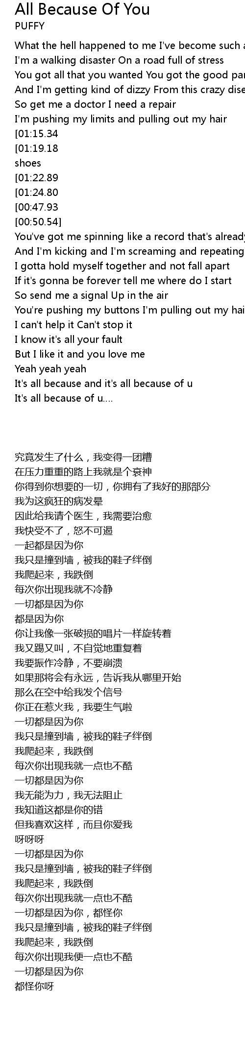 | [00:44.09][00:47.93][01:29.49][01:46.06][02:18.61] | It' s all because of u |