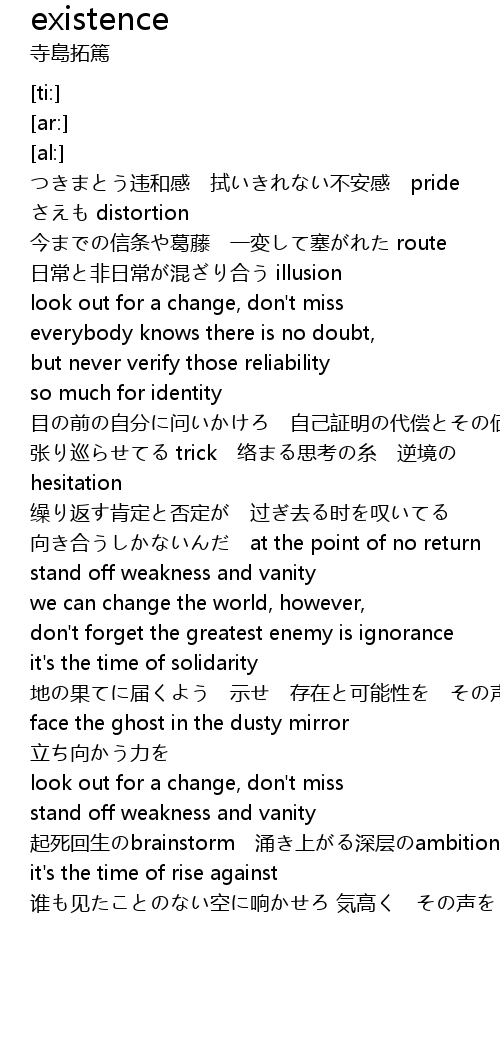 | [02:02.08] | 地の果てに届くよう 示せ 存在と可能性を その声で |