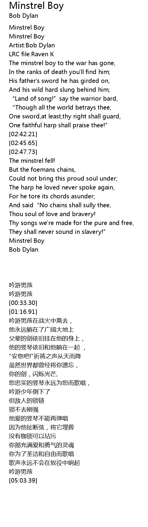 | [01:31.18] | The minstrel boy to the war has gone, |