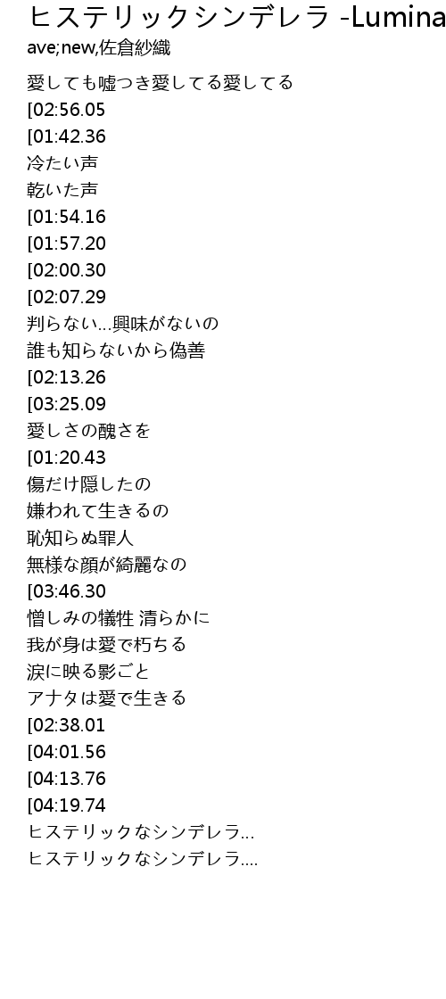 | [01:14.53][01:20.43][02:22.47][02:28.95][03:30.95][03:37.18] | ヒステリックなシンデレラ |