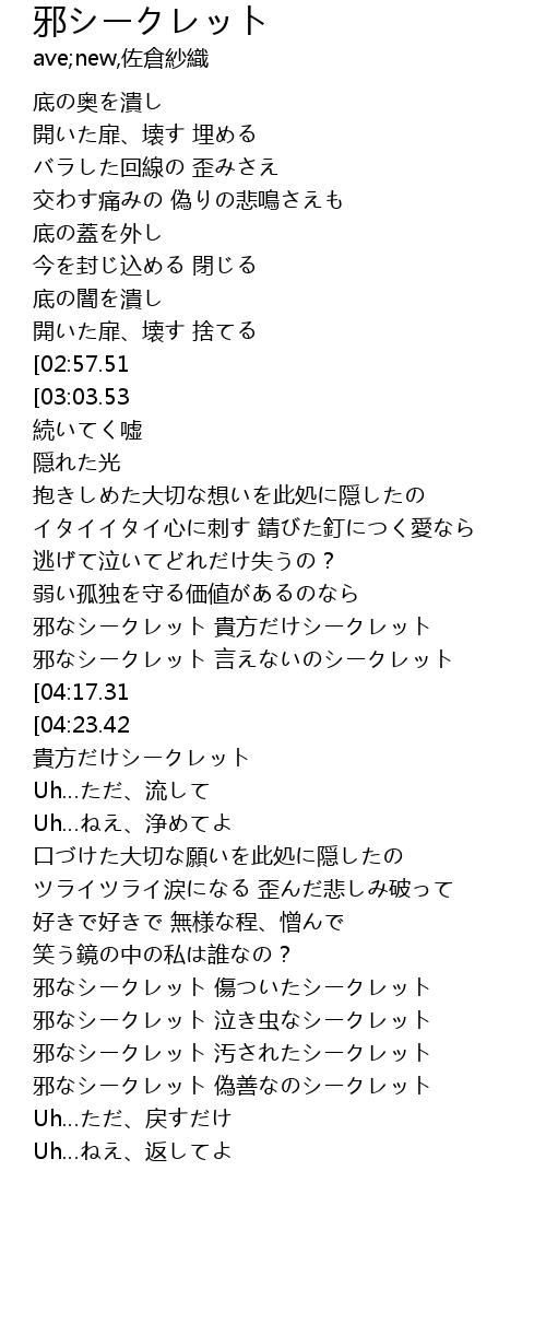 | [01:59.37][04:17.31] | 邪なシークレット 最悪なシークレット |