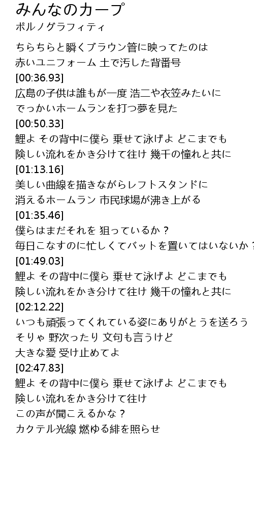 | [00:37.51] | 広島の子供は誰もが一度 浩二や衣笠みたいに |