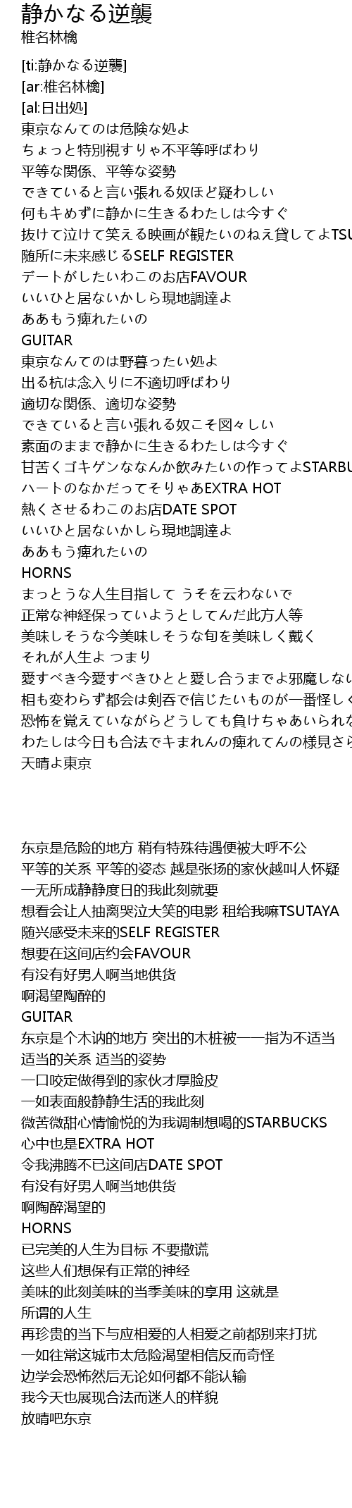 | [00:46.530] | 何もキめずに静かに生きるわたしは今すぐ |