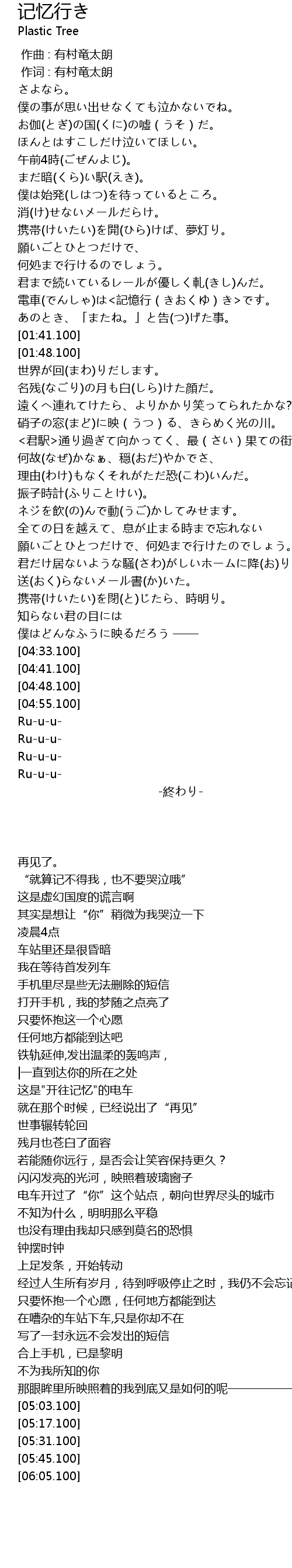 | [01:27.100] | 電車(でんしゃ)は<記憶行(きおくゆ)き>です。 |