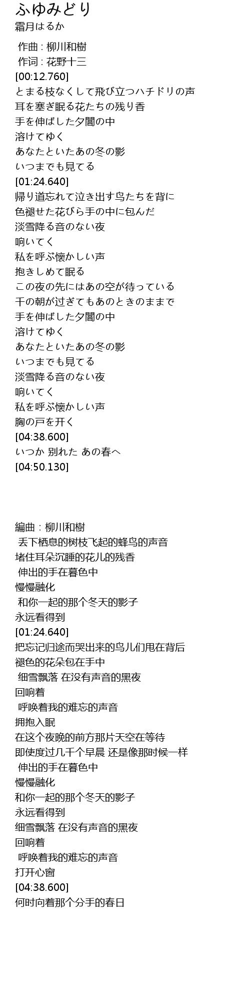 | [00:18.360] | とまる枝なくして飛び立つハチドリの声 |