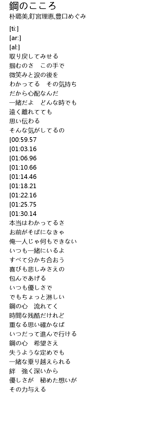 | [03:08.22][00:59.57] | 鋼の心 一人ずつ |
