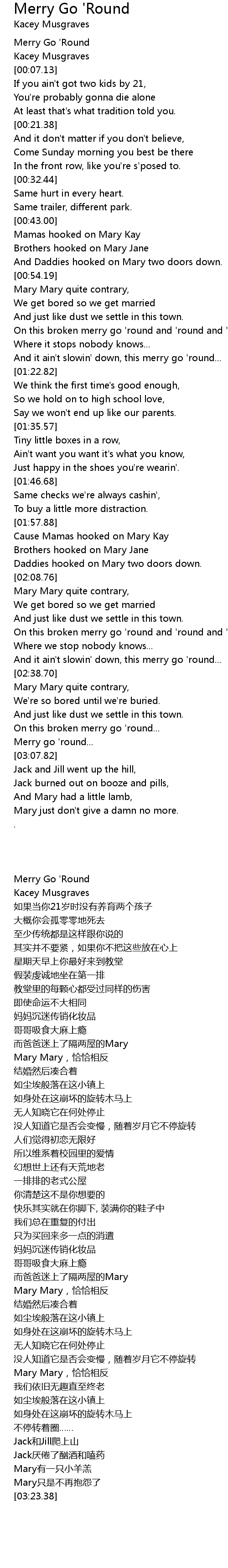 On this broken merry go 'round and 'round and 'round we go, |