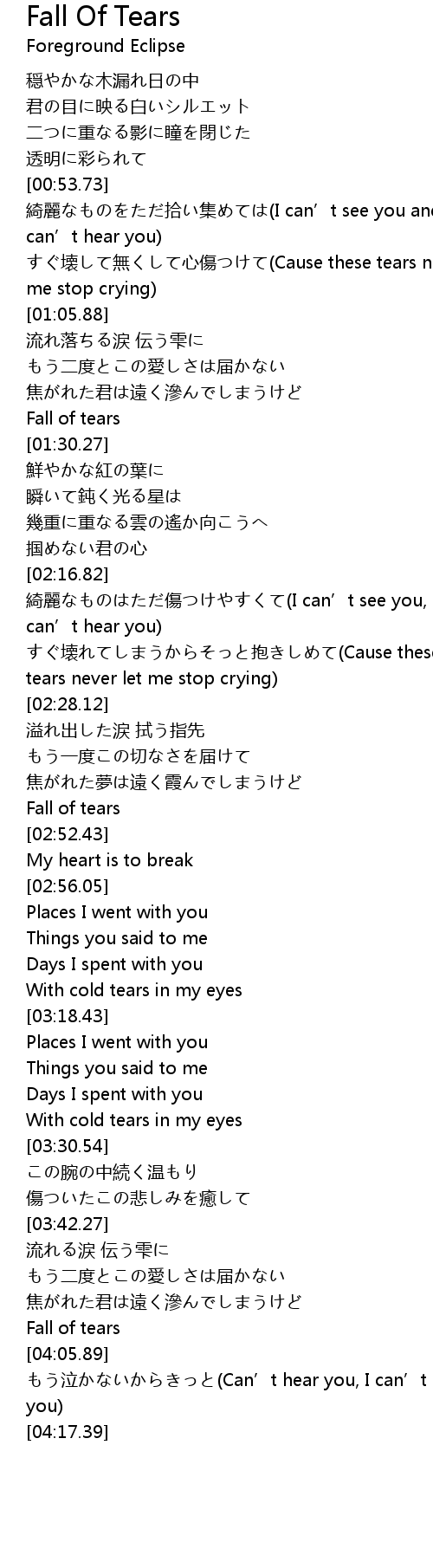 | [02:22.35] | すぐ壊れてしまうからそっと抱きしめて(Cause these tears never let me stop crying) |