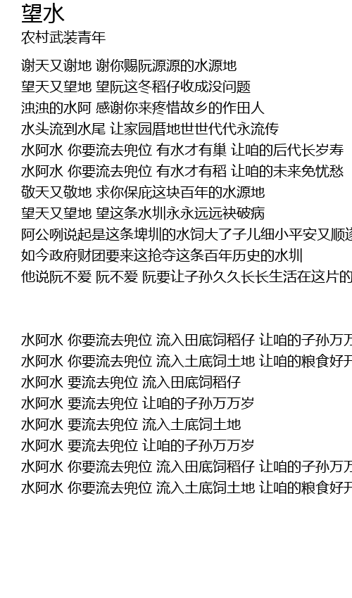 | 水阿水 你要流去兜位 流入土底饲土地 让咱的粮食好开花 |