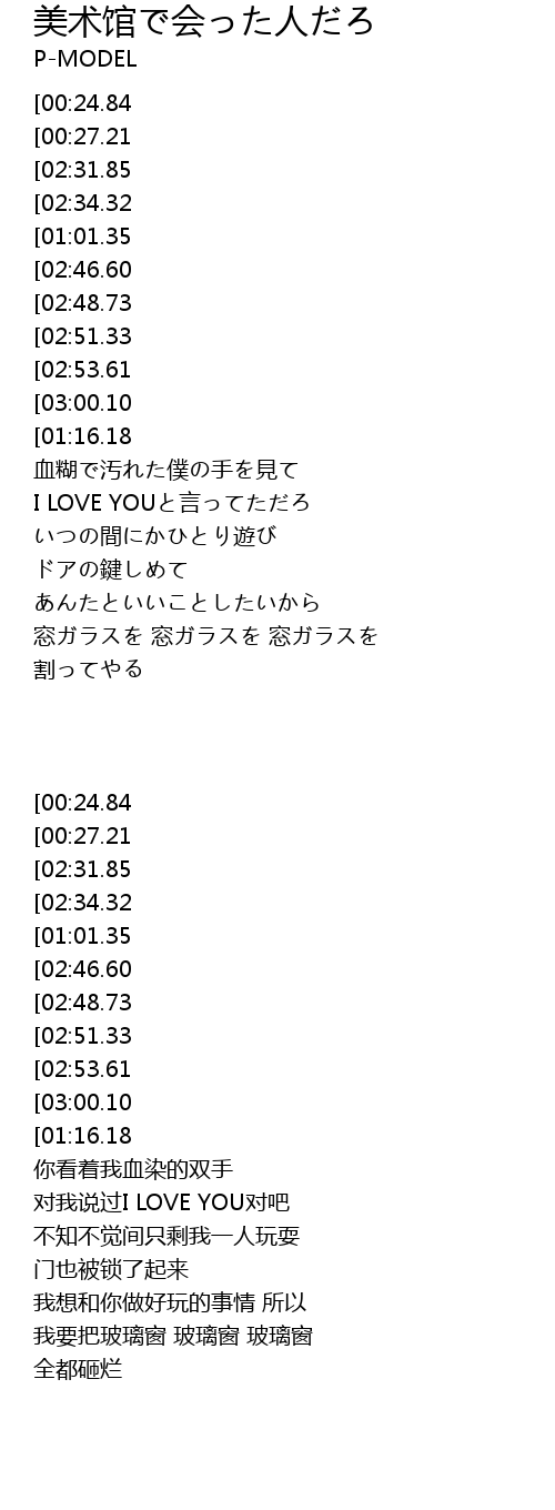 | [00:19.89][00:24.84][00:34.61][02:22.16][02:26.99][02:36.77] | 美術館で会った人だろ |