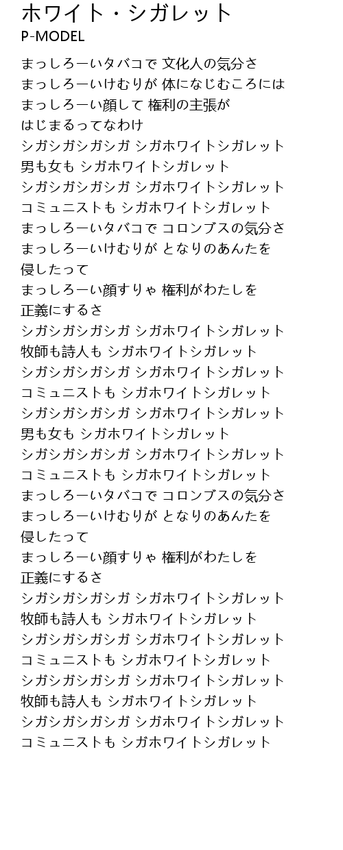 | [00:59.45] | コミュニストも シガホワイトシガレット |
