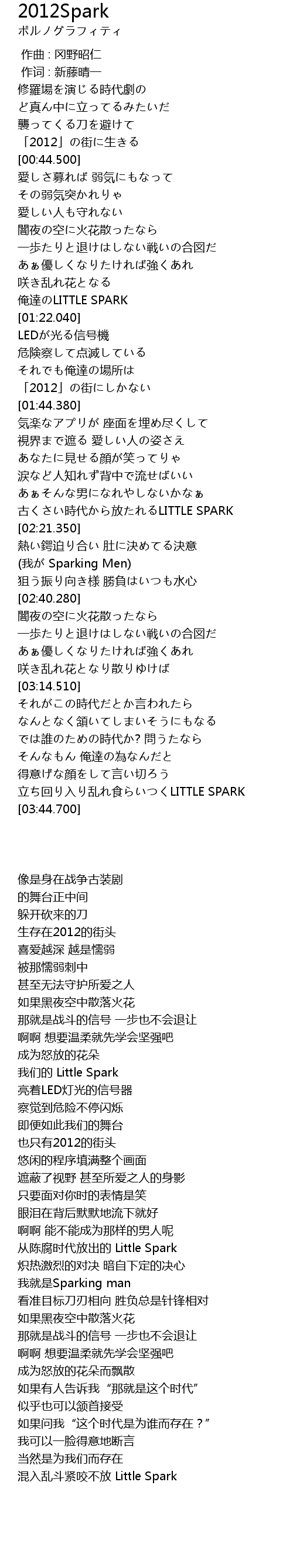 | [03:35.880] | 立ち回り入り乱れ食らいつくLITTLE SPARK |