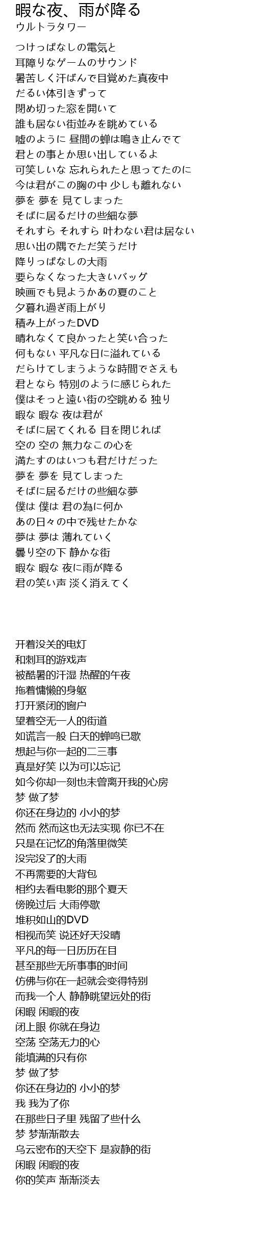 | [04:49.240] | 暇な 暇な 夜に雨が降る |