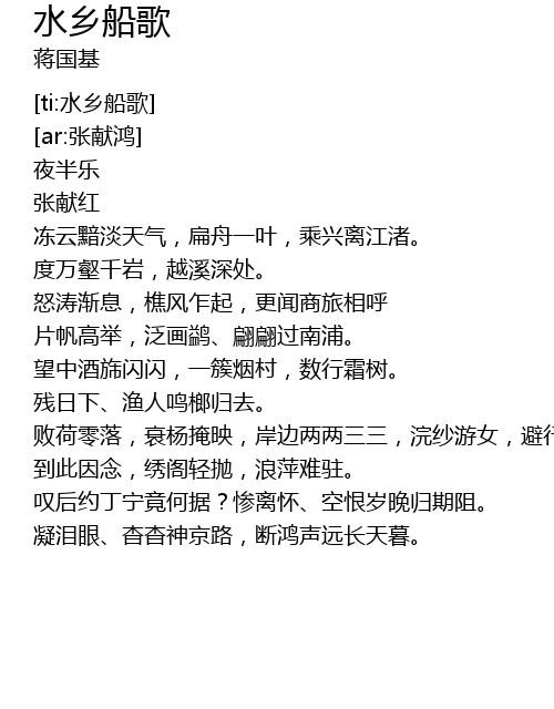 | [03:23.32] | 凝泪眼、杳杳神京路,断鸿声远长天暮。 |