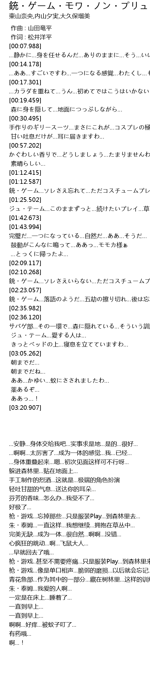 | [02:10.268] | 銃・ゲーム…ソレさえいらない…ただコスチュームプレイ…森になりきるの… |