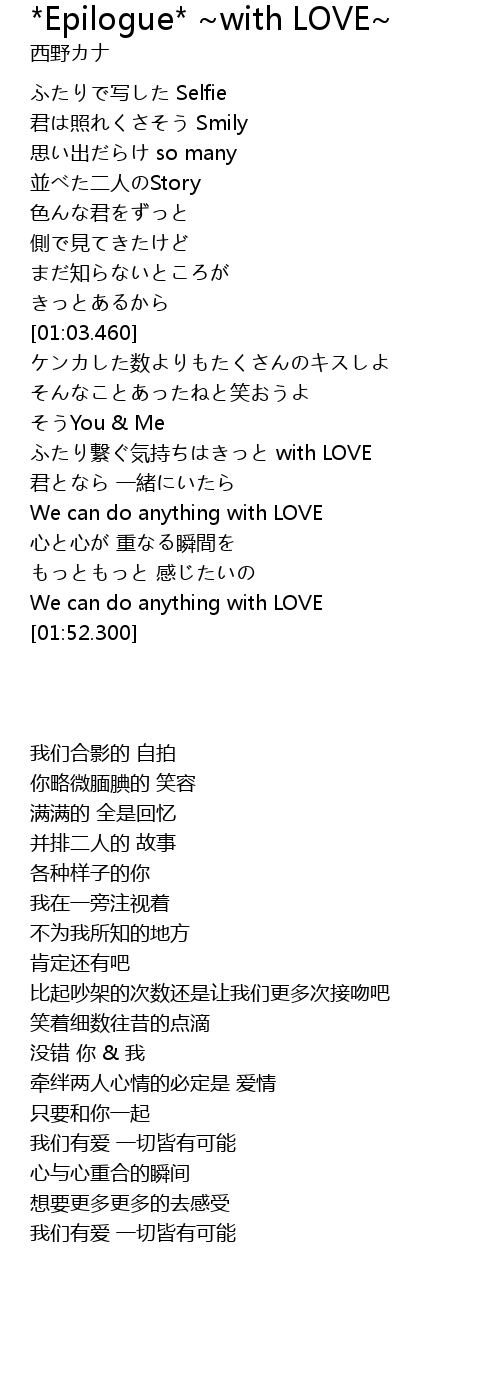 | [01:20.960] | ふたり繋ぐ気持ちはきっと with LOVE |