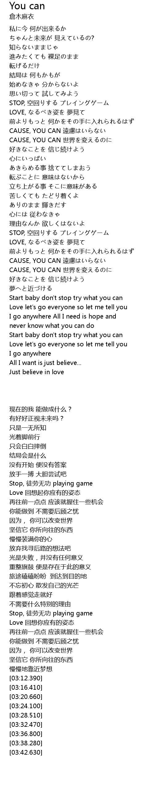 | [01:08.310] | CAUSE, YOU CAN shì jiè biàn |