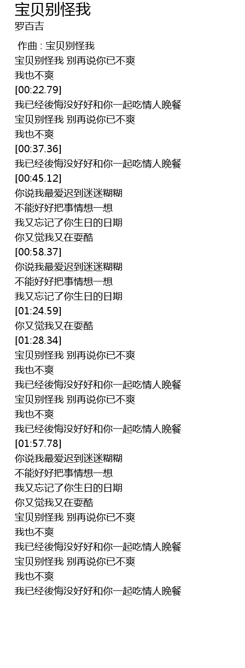 | [01:29.05] | bǎo bèi bié guài wǒ bié zài shuō nǐ yǐ bù shuǎng |