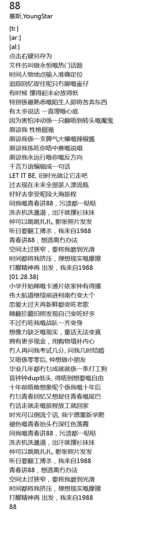 | [01:16.86] | 青春讲88,想逃离冇办法 |