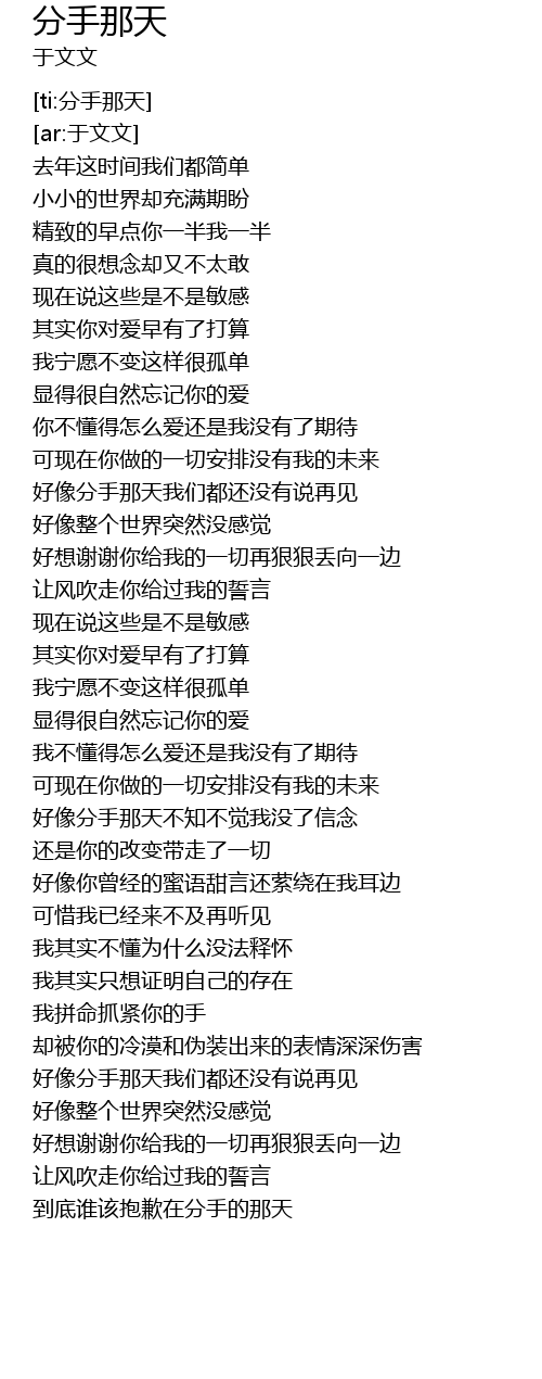 | [03:48.378] | 到底谁该抱歉在分手的那天 |