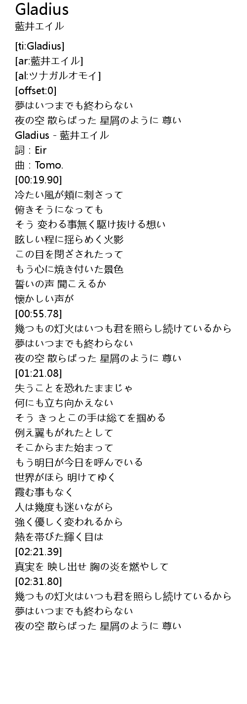 | [00:13.71] | Gladius - 藍井エイル |