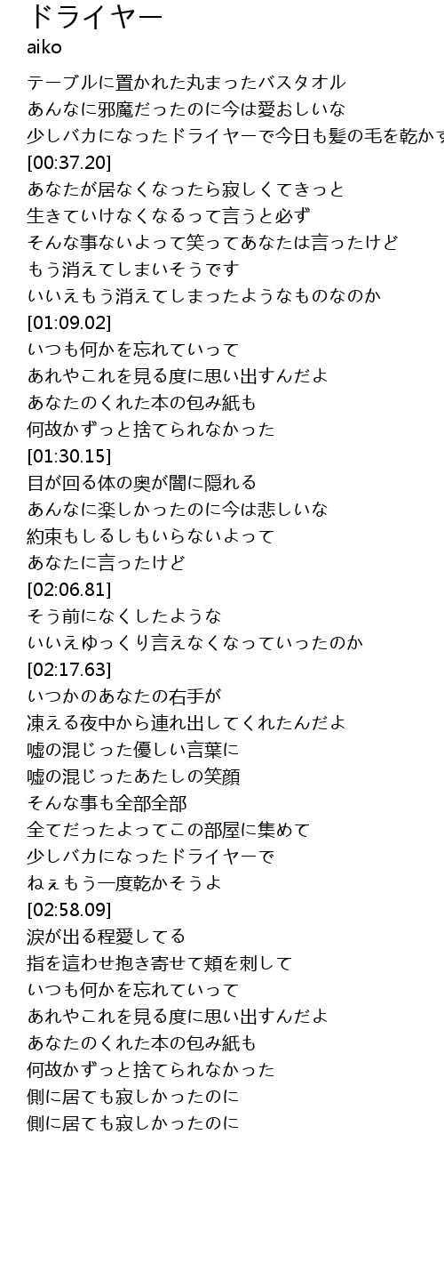 | [00:28.65] | 少しバカになったドライヤーで今日も髪の毛を乾かすよ |