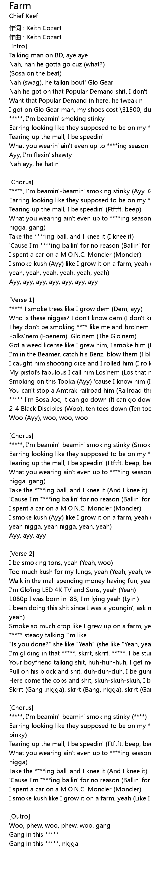 | I smoke kush Ayy like I grow it on a farm, yeah Like I grow it on a farm, yeah, yeah, yeah, yeah, yeah, yeah | |