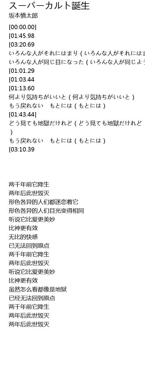| [03:10.43][01:45.98][00:21.22] | 二千年前それは生まれ(二千年前それは生まれ) |