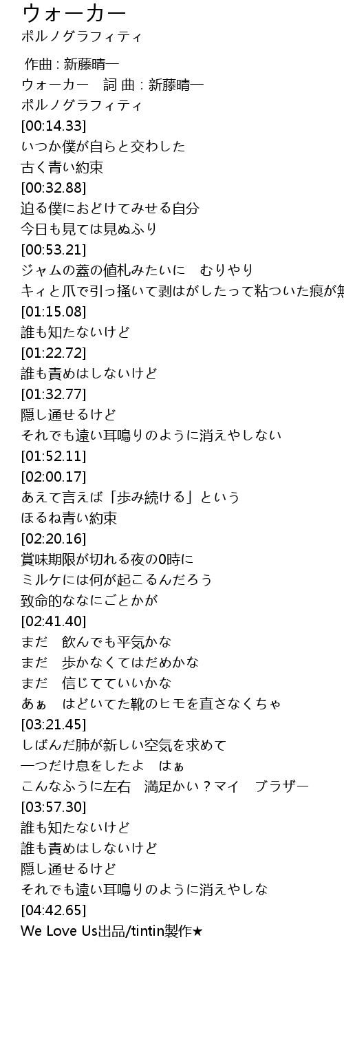 | [00:04.03] | ウォーカー 詞 曲:新藤晴一 |