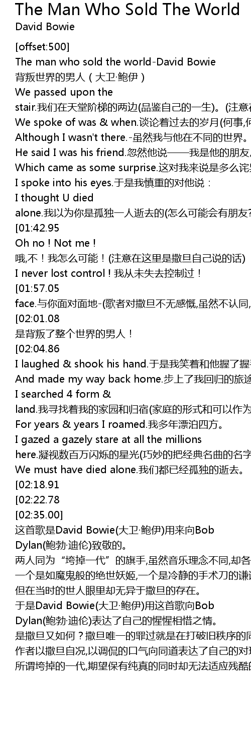 | [03:00.00] | 于是David Bowie(大卫·鲍伊)用这首歌向Bob Dylan(鲍勃·迪伦)表达了自己的惺惺相惜之情。 |