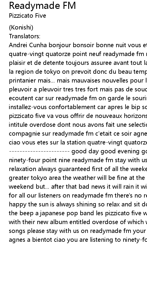Andrei Cunha bonjour bonsoir bonne nuit vous etes bien a l'ecoute de quatre-vingt quatorze point neuf readymade fm restez avec nous pour un moment de plaisir et de detente toujours assuree avant tout la meteo de ce week-end pour la region de tokyo on prevoit donc du beau temps en debut de ce week-end printanier mais... mais mauvaises nouvelles pour la suite car il se mettra a pleuvoir a pleuvoir tres tres fort mais pas de soucis pour ceux qui nous ecoutent car sur readymade fm on garde le sourire et la bonne humeur allors installez-vous confortablement car apres le bip sonore un group pop japonais les pizzicato five va vous offrir de nouveaux horizons avec leur dernier album intitule overdose dont nous avons fait une selection restez donc en notre compagnie sur readymade fm c'etait ce soir agnes qui vous divertissait a bientot ciao vous etes sur la station quatre-vingt quatorze point neuf readymade fm ----------------------- good day good evening good night you are listening to ninety-four point nine readymade fm stay with us for a moment of pleasure and relaxation always guaranteed first of all the weekend weather forecast for the greater tokyo area the weather will be fine at the beginning of this spring weekend but... after that bad news it will rain it will pour a lot of water but for all our listeners on readymade fm there's no reason to worry we're always happy the sun is always shining so relax and sit down comfortably because after the beep a japanese pop band les pizzicato five will open new dimensions for you with their new album entitled overdose of which we've compiled a selection of songs please stay with us on readymade fm your host on air tonight my name is agnes a bientot ciao you are listening to ninety-four point nine readymade fm