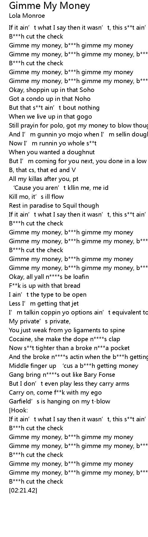 | [02:13.89] | Gimme my money, b h gimme my money |