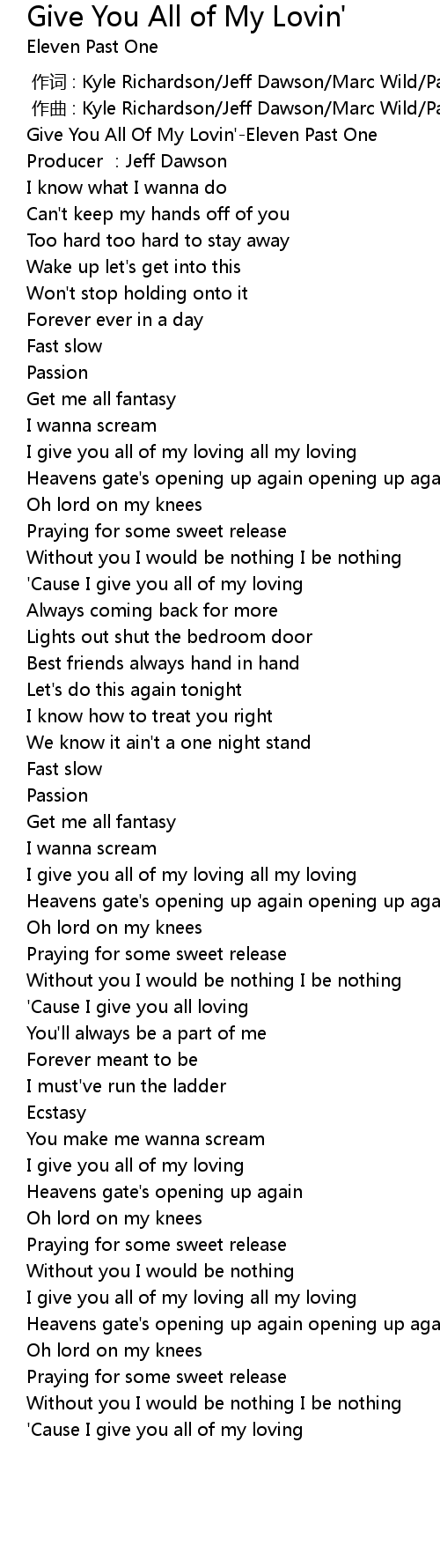 | [00:00.113] | Give You All Of My Lovin' Eleven Past One |