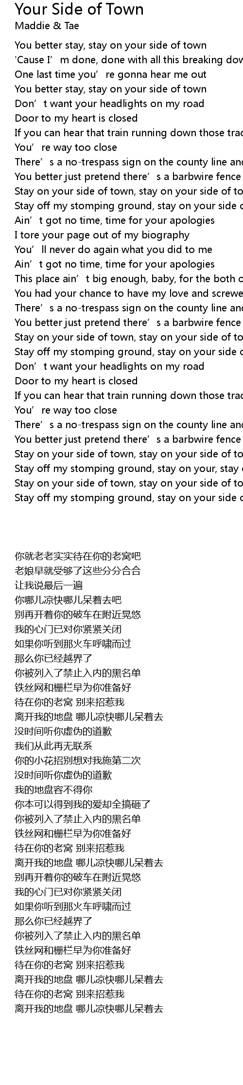 | [00:52.48] | Stay on your side of town, stay on your side of town |