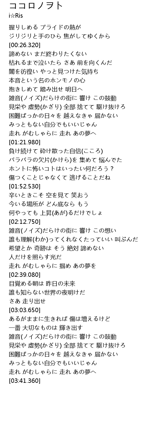 | [03:26.210] | 困難ばっかの日々を 越えなきゃ 届かない |