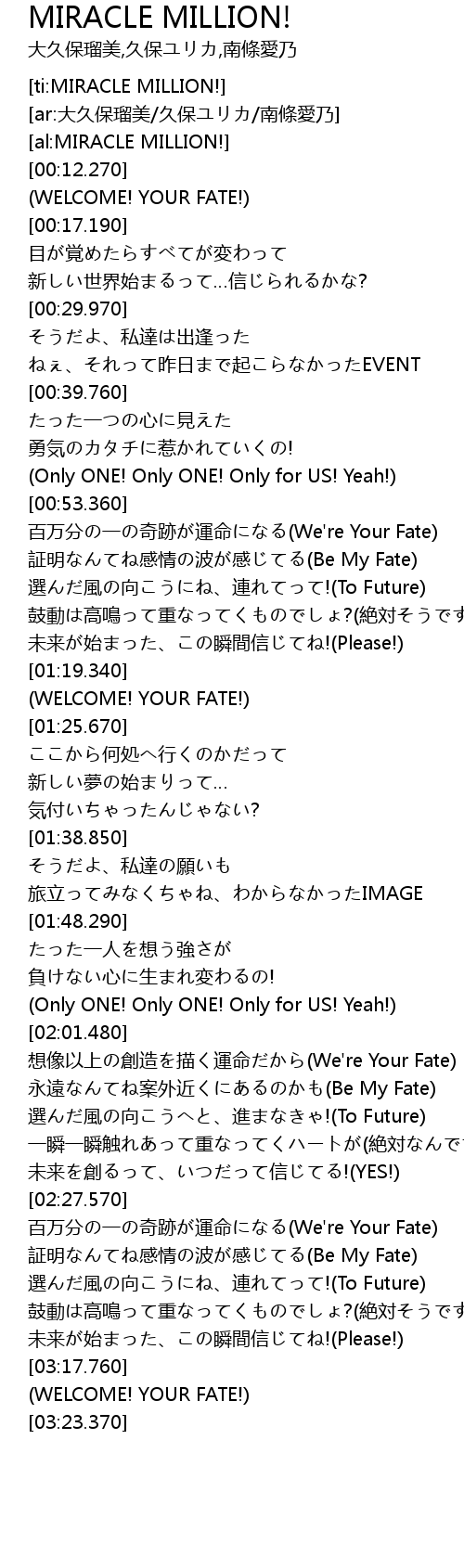 | [02:51.880] | 百万分の一の奇跡が運命になる(We're Your Fate) |