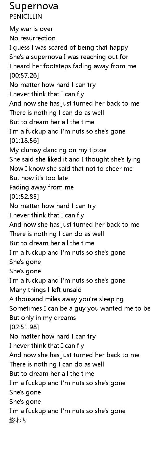 | [03:07.43] | I'm a fuckup and I'm nuts so she's gone |