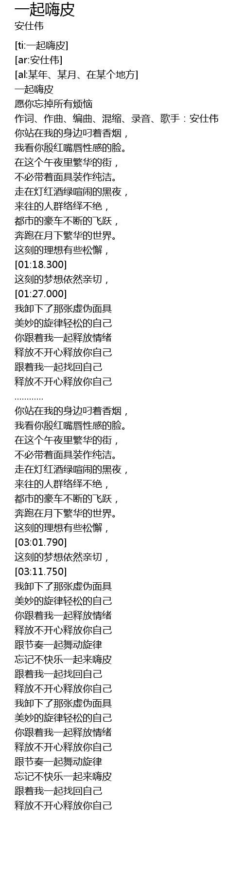 | [00:18.390] | 作词、作曲、编曲、混缩、录音、歌手:安仕伟 |