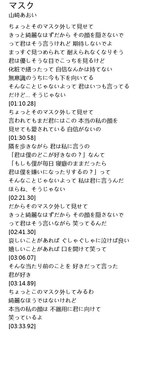 | [00:00.88] | ちょっとそのマスク外して見せて |