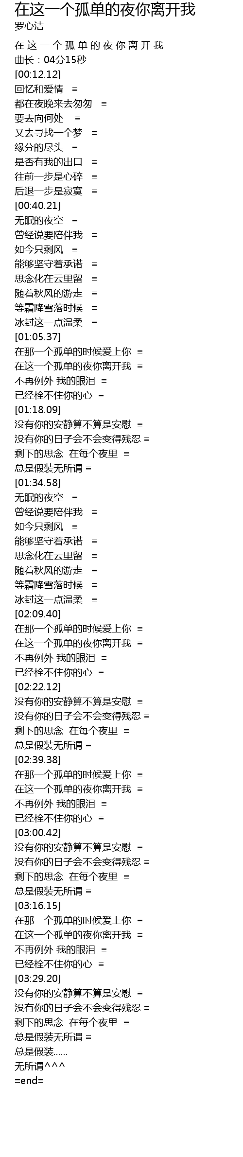 | [03:20.18] | 在这一个孤单的夜你离开我 ≡ |