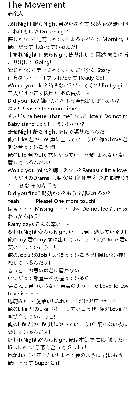 | 抱かれたい! 守りたい! まるで夢のように 君はもう 俺にとって Super Girl! |