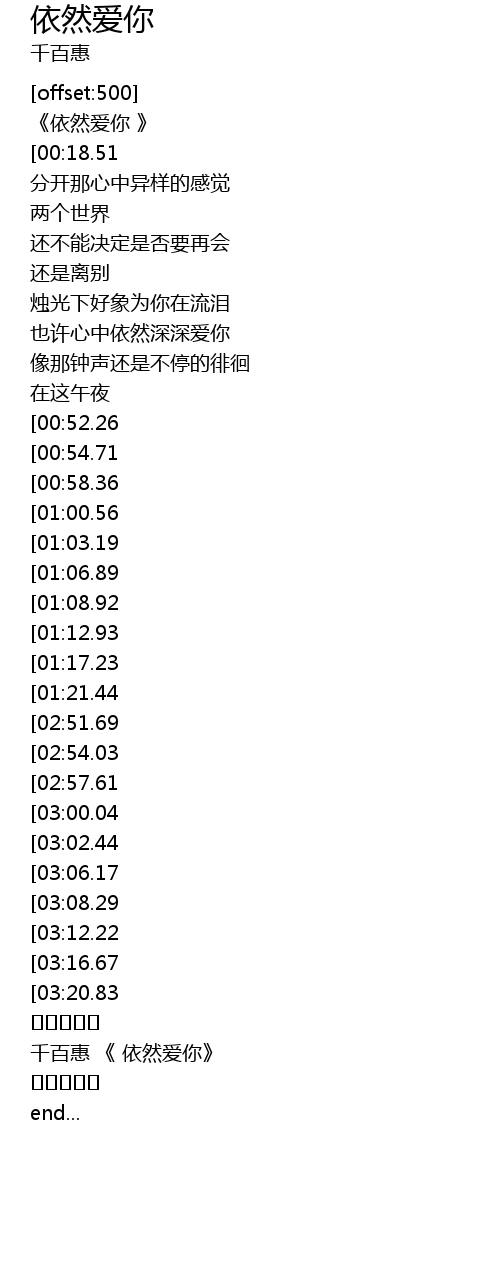| [02:01.99] | 千百惠 《 依然爱你》 |