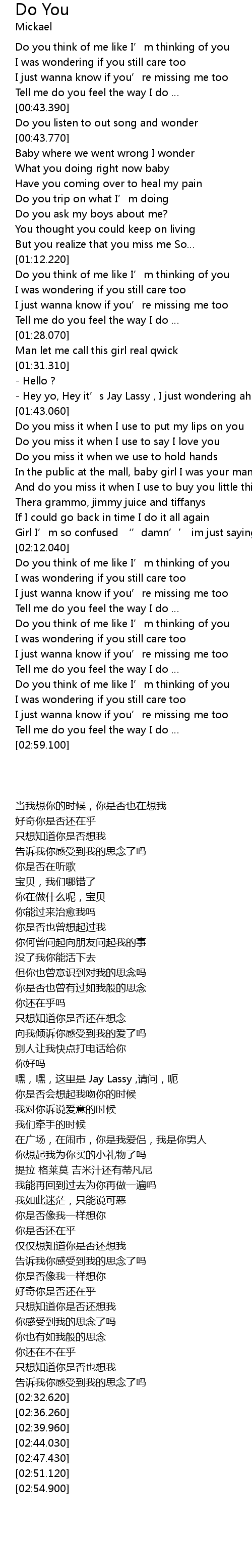 | [01:43.820] | Do you miss it when I use to put my lips on you |
