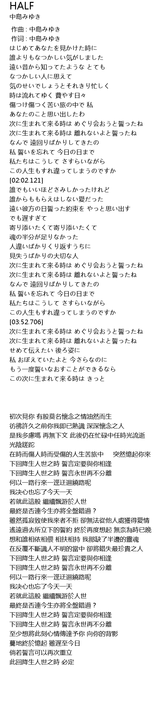 | [00:01.00] | 作词 : 中島みゆき |