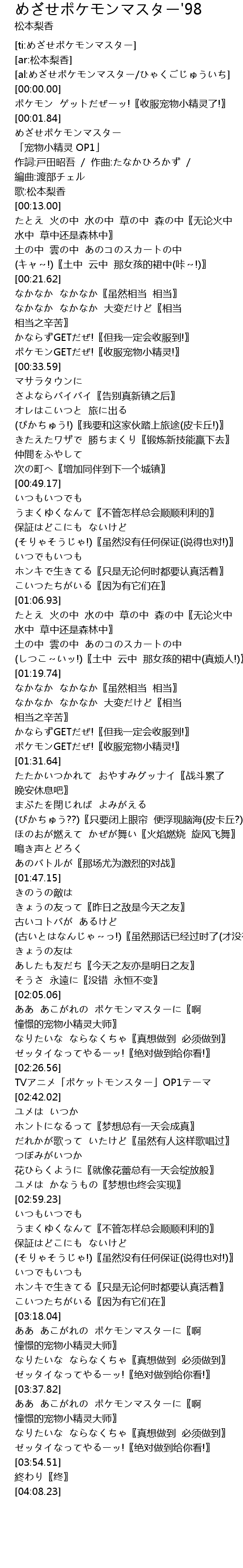 | [03:38.54] | ああ あこがれの ポケモンマスターに〖啊 憧憬的宠物小精灵大师〗 |
