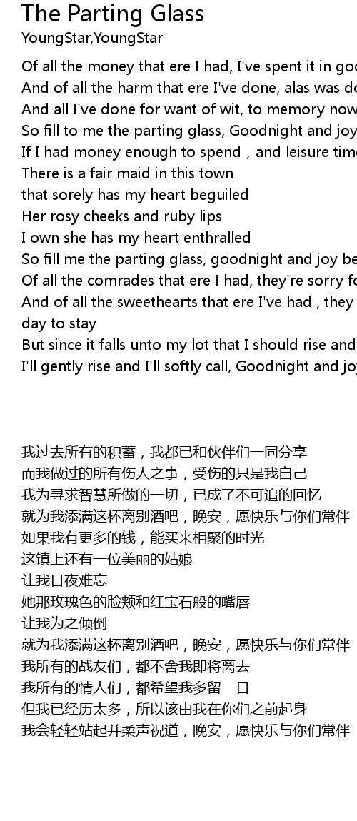 | [00:56.85] | So fill to me the parting glass, Goodnight and joy be to you all |