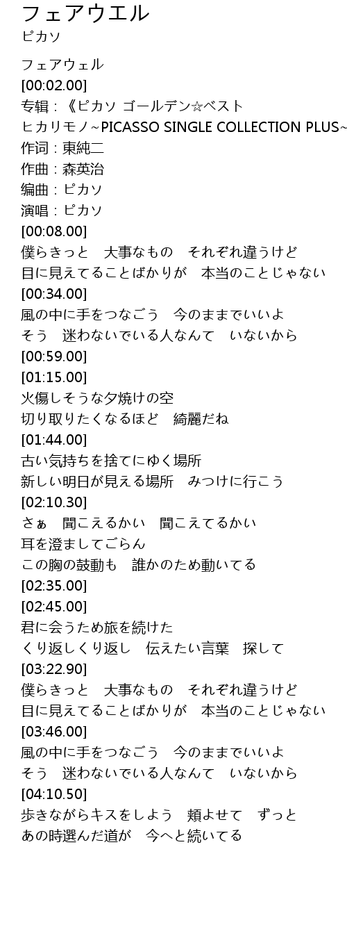 | [00:03.00] | 专辑:《ピカソ ゴールデン☆ベスト ヒカリモノ~PICASSO SINGLE COLLECTION PLUS~》 |