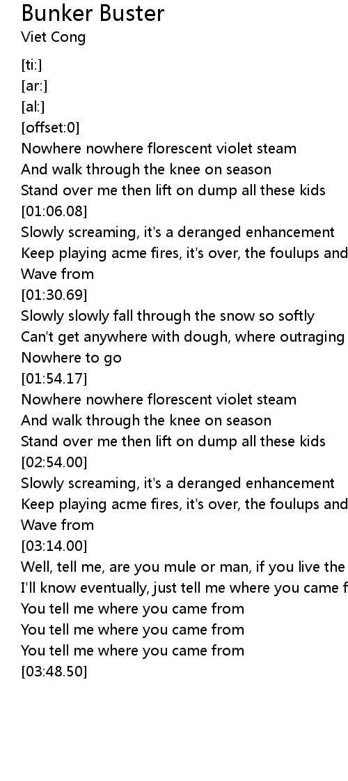 | [02:41.00] | Nowhere nowhere florescent violet steam |