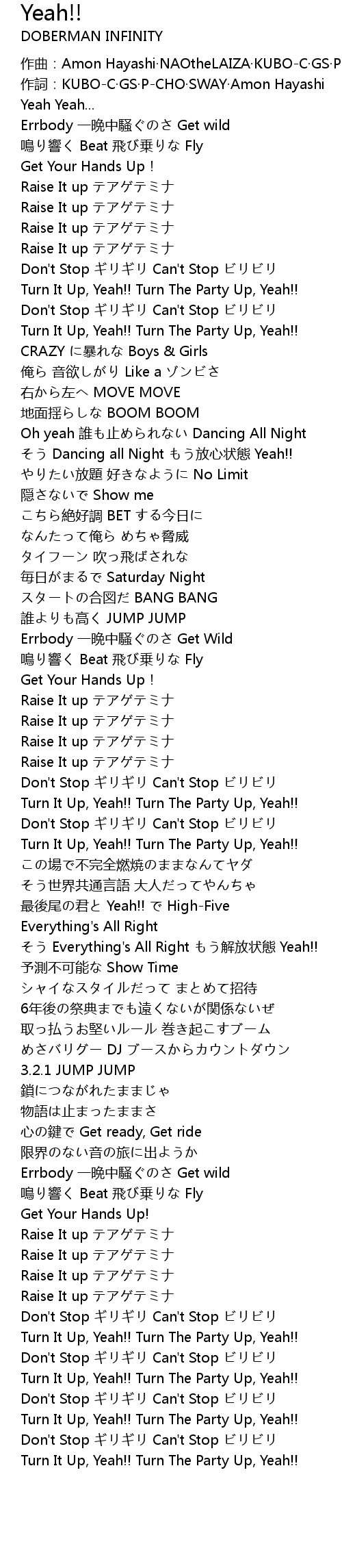| [04:02.18] | Turn It Up, Yeah!! Turn The Party Up, Yeah!! |