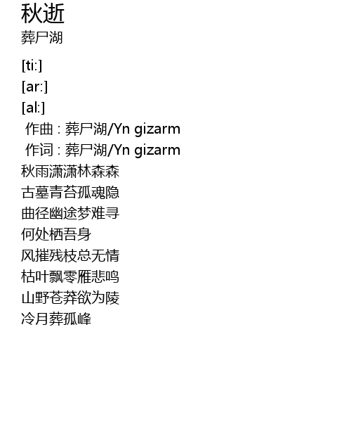 | [00:01.00] | 作词 : 葬尸湖/Yn gizarm |